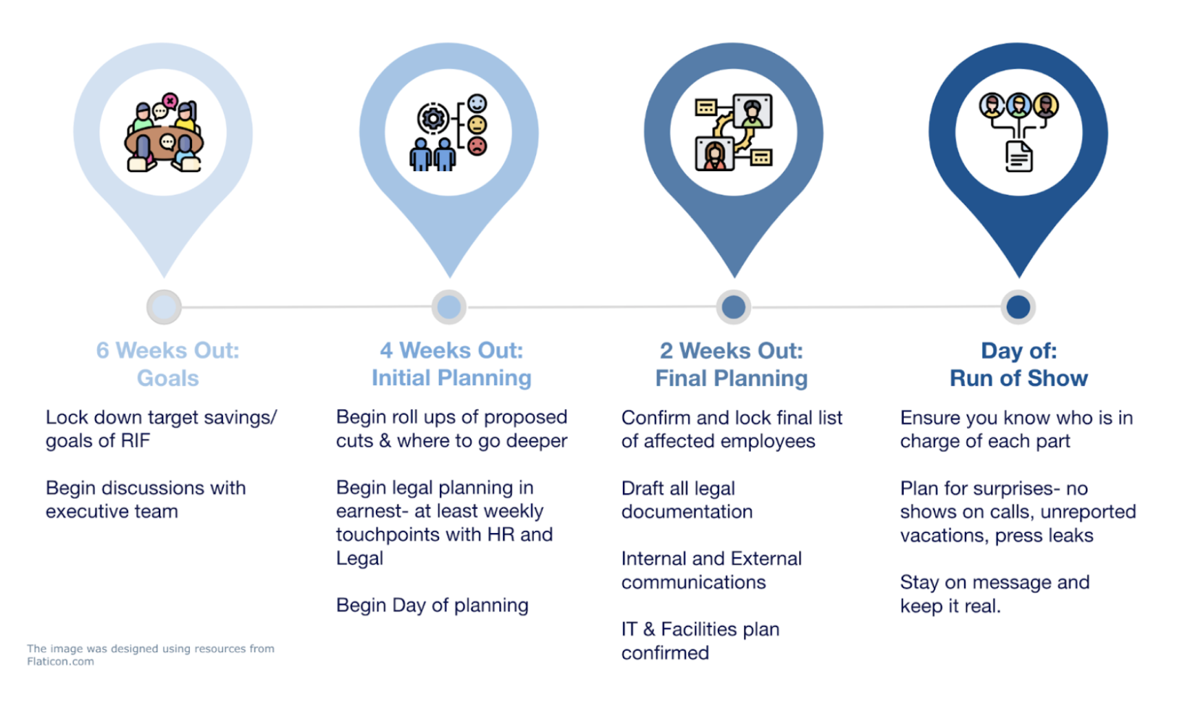- Run of show for the day of: similar to the broader timeline, you will want a timeline for the day of the RIF, which will include schedule and timing of individual meetings, team emails, any public-facing blog posts, all-hands meeting, IT/physical access, etc.